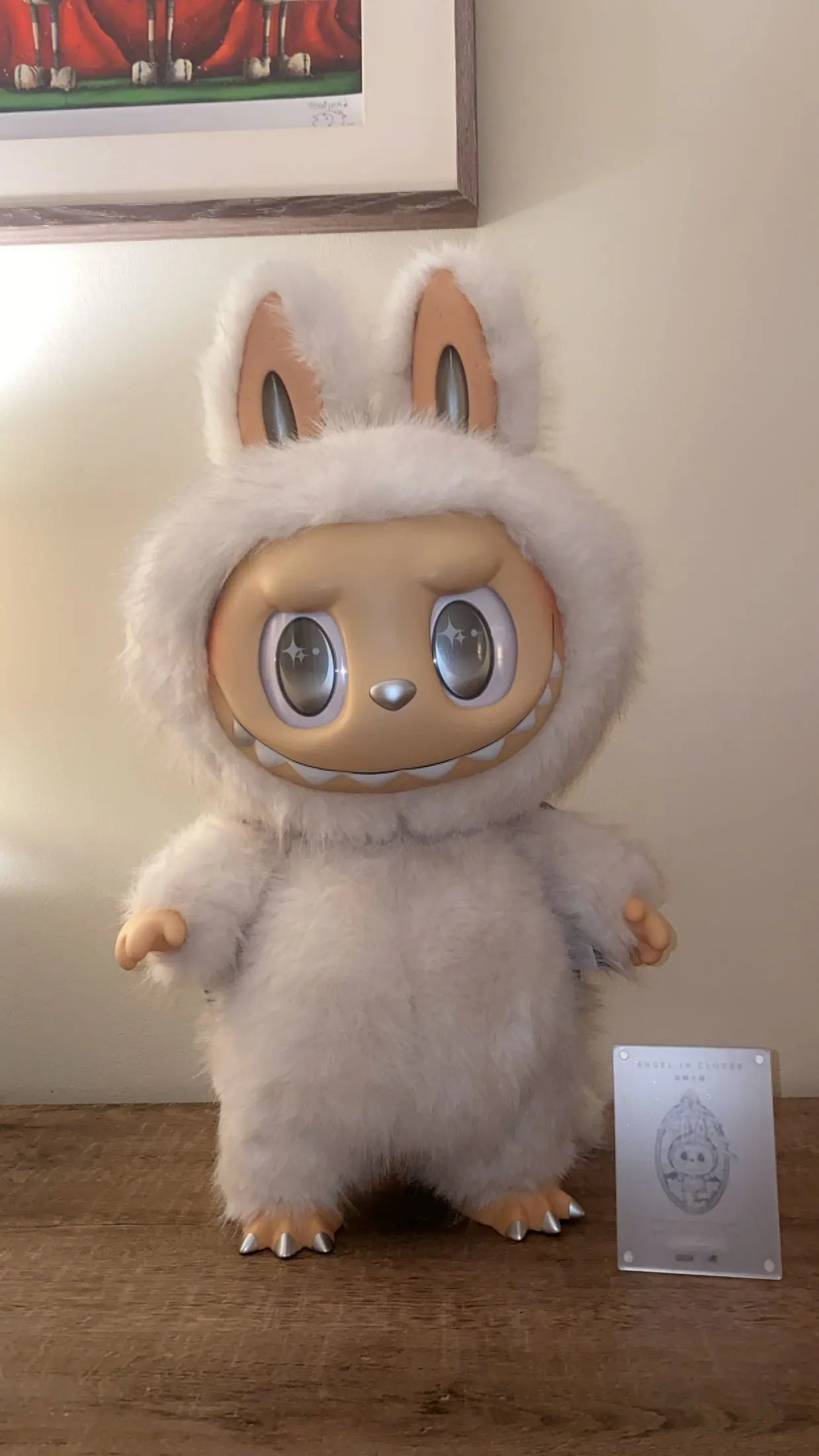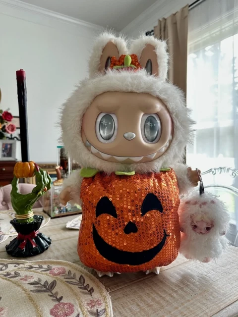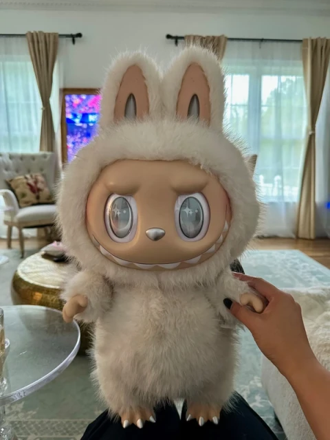This set includes a plush Zimomo with a vinyl face and an all-white body, plus a canvas tote bag printed with Roman columns and heavenly details. This version of Labubu takes on an angelic look, featuring sharp teeth, ear details, wings, and metallic-silver accents. Influenced by Nordic mythology, this design has become a pop-culture favorite, often seen worn by celebrities, K-pop idols, and online influencers.
