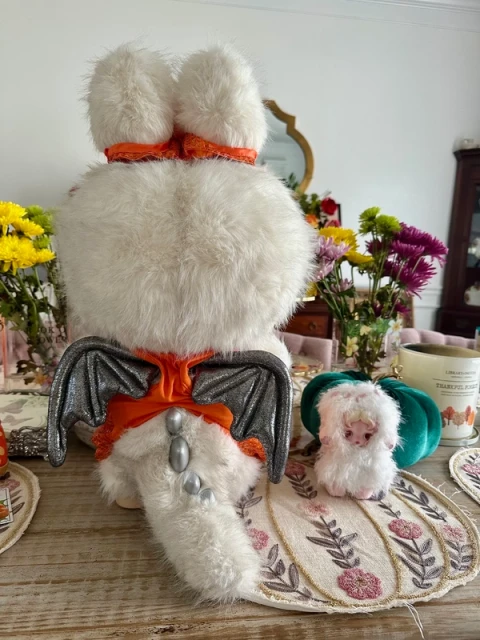 "If you are on the fence about purchasing Angel in the Clouds, I think you should go for it. Especially if you are a collector! It is large, great quality, and super soft. You can reposition the arms, legs, eyes, and tail. Here is mine dressed in a M/L dog pumpkin Halloween costume!"