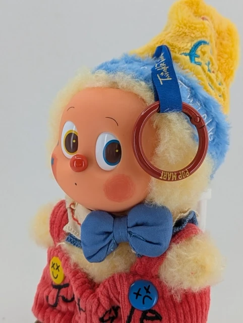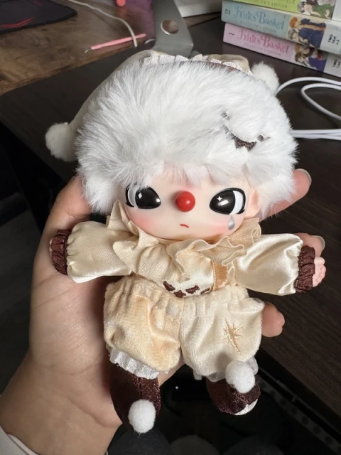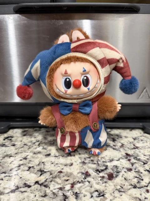 This character is Labubu, a fuzzy, brown creature with a wide, smiling clown face and a bright red nose.